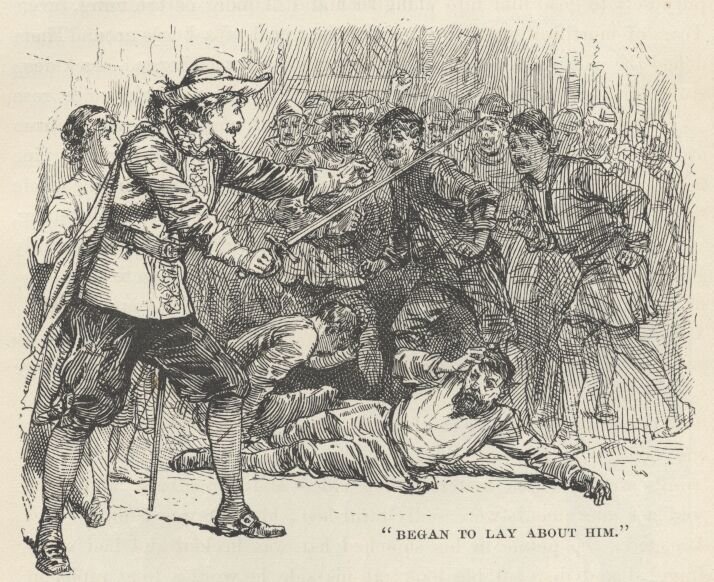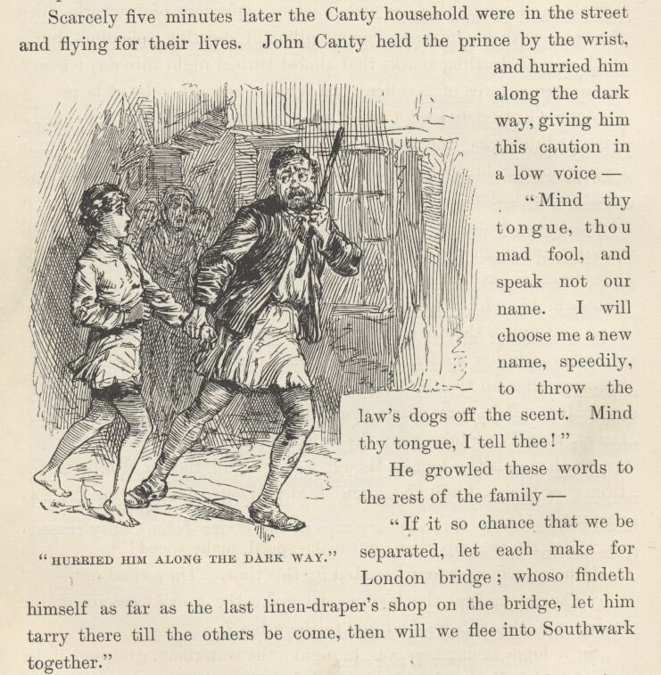 トムを虐待した兵士は即座に従った。そして、王子が王家の怒りに半ば窒息しながら門を突き破って出ると、兵士は彼の耳に強烈な平手打ちを食らわせ、彼を道に吹き飛ばして言った。