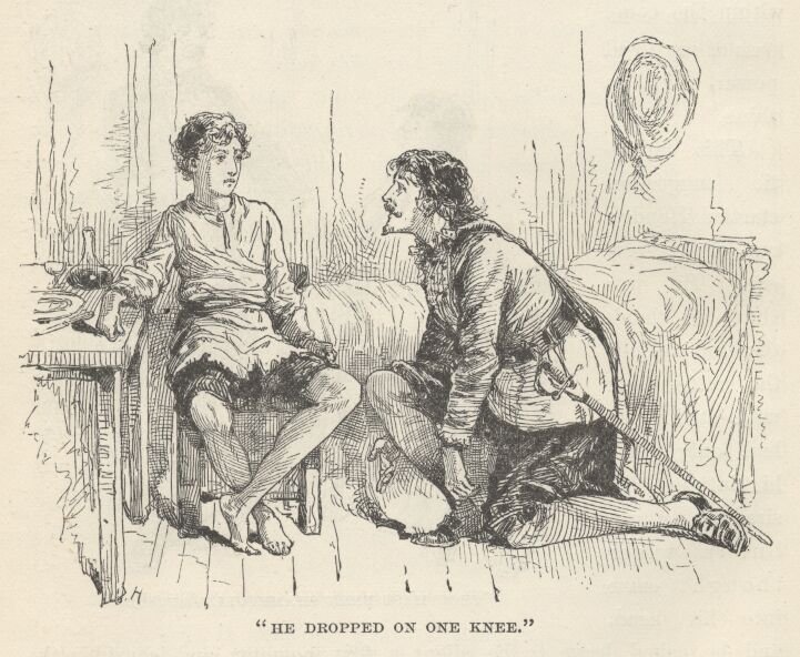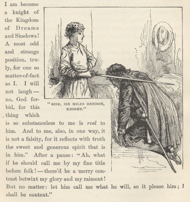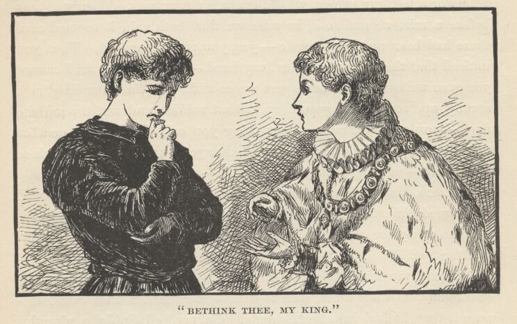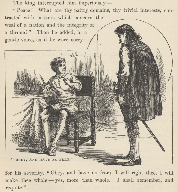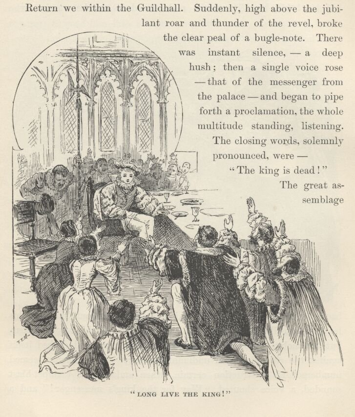 マイルズ・ヘンドンは完全に当惑していた。五歩先には、天蓋付きの玉座に若き王が座り、頭を傾けて、人間離れした極楽鳥のような人物――おそらくは公爵だろう――と話していた。ヘンドンは、人生の盛りに死刑を宣告されるだけでも十分に辛いのに、こんな風に人前で屈辱を加えられるとは、と独りごちた。王にはさっさと事を済ませてほしいものだ――近くにいるけばけばしい連中が、かなり不愉快になってきた。その瞬間、王がわずかに顔を上げ、ヘンドンはその顔をはっきりと見ることができた。その光景に、彼は息を呑んだ! ――彼はその美しい若者の顔を、釘付けになったように見つめていた。やがて、こう叫んだ――