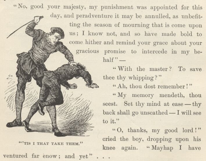 ジェームズ一世とチャールズ二世は、幼少期に、学業でしくじった際に代わりに罰を受けるための身代わり少年を持っていた。そこで私は、私自身の目的のために、我が小さな王子にも一人提供することにした。