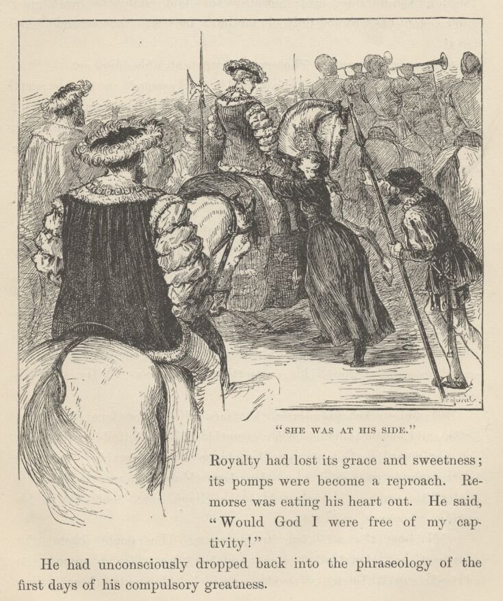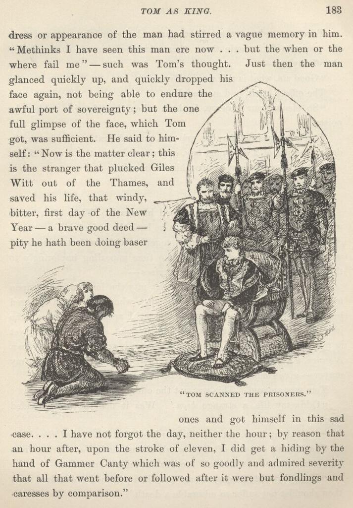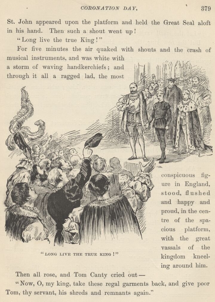 彼は再び王を見つめ、思った。「これは夢なのか……それとも、彼こそが正真正銘のイングランド国王で、俺が思い込んでいたような、友もなき精神病院帰りのトムではないのか――誰がこの謎を解いてくれるというのだ?」