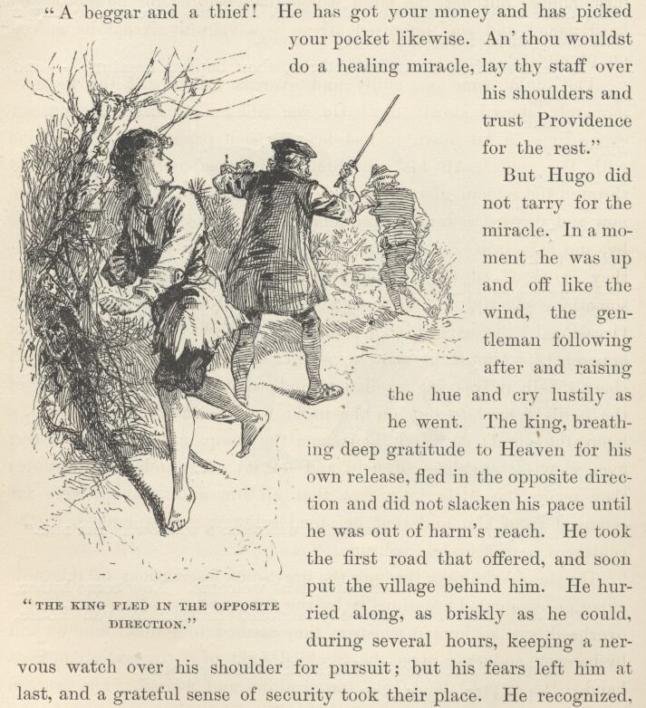 「またもや新たな王位僭称者か!」と士官は叫んだ。「まこと、近頃はウサギのように湧いてきおる。この悪党を捕らえよ、者ども。この貴重な紙を中に運び、王にお届けする間、しっかりと見張っておけ。」