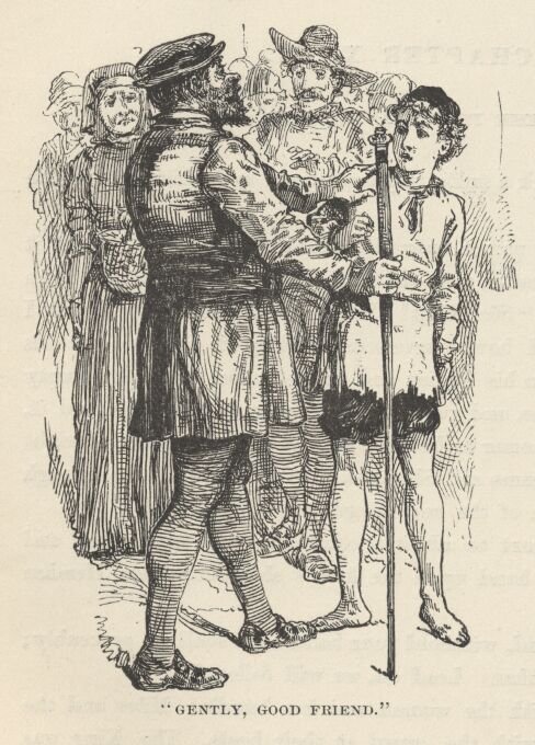 哀れな小さなトムは、ぼろをまとい、高鳴る胸と膨らむ希望を抱いて、ゆっくりとおずおずと衛兵のそばを通り過ぎようとしていた。その時、ふと金色の格子の向こうに、喜びのあまり叫び出しそうになる光景を目にした。中にいたのは、頑健な戸外でのスポーツや運動で日に焼けた、美しい少年だった。彼の衣服はすべて愛らしい絹と繻子でできており、宝石で輝いていた。腰には宝石をちりばめた小さな剣と短剣を帯び、足には赤い踵の優美な半長靴を履き、頭には大きな輝く宝石で留められた羽飾りの垂れた、粋な深紅色の帽子をかぶっていた。近くには数人の豪華な紳士が立っていた――間違いなく彼の従者だろう。おお! 彼は王子だ――王子、生きている王子、本物の王子だ――疑いの影すらなかった。そして、乞食の少年の心の祈りは、ついに聞き届けられたのだ。