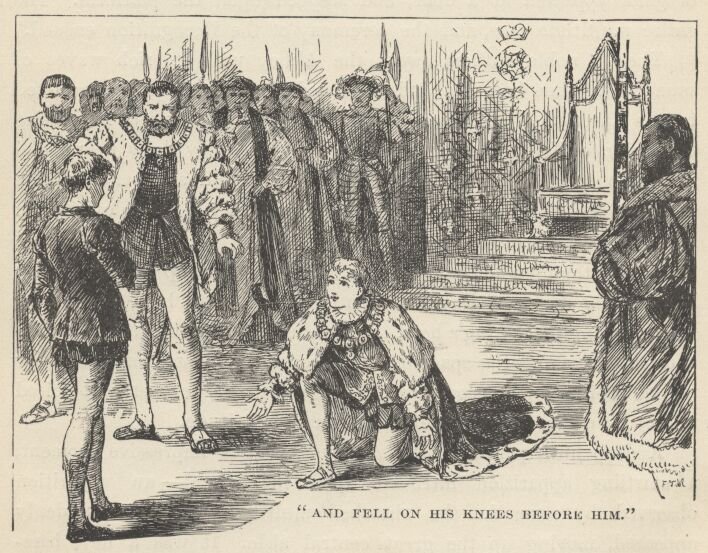 誇りと喜びに満ちたトム・キャンティは立ち上がって王の手に口づけをし、御前から退出した。彼は少しも時間を無駄にせず、母のもとへ飛んで帰り、母とナンとベットにすべてを語り、この素晴らしい知らせを共に喜んでもらうのだった。