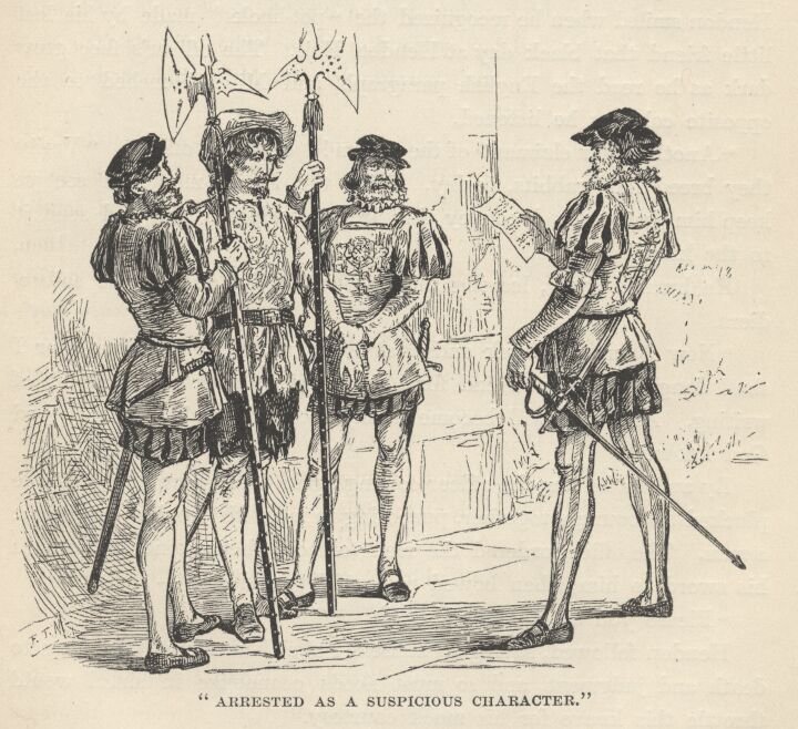 ヘンドンは示された場所――宮殿の壁に設けられた窪みで、石のベンチが備え付けられている、悪天候の際の歩哨の避難所――へと下がった。彼が腰を下ろすか下ろさないかのうちに、士官に率いられた数人の矛槍兵が通りかかった。士官は彼を見つけると部下を停止させ、ヘンドンに出てくるよう命じた。彼はそれに従い、宮殿の敷地内をうろつく不審人物として、即座に逮捕された。事態は険悪な様相を呈し始めた。哀れなマイルズは説明しようとしたが、士官は荒々しく彼を黙らせ、部下に武器を取り上げ、身体を改めるよう命じた。