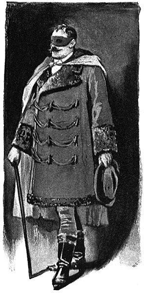 入ってきた男は、少なくとも身長が2メートル近くあり、胸も手足もヘラクレスのようにたくましかった。着ているものは英国でなら悪趣味と見なされかねないほど豪奢だった。アストラカンの太い帯がダブルのコートの袖と前身頃に飾られ、肩に羽織った深い青のマントは炎のような絹で裏打ちされ、首元には真紅のベリル一個をあしらったブローチがとまっていた。ふくらはぎまであるブーツは高級な茶色の毛皮縁で、彼の姿全体から野性的な豪奢さが漂っていた。手にはつばの広い帽子、顔の上半分には頬骨まで覆う黒い仮面――今まさにつけたばかりらしく、まだ手がその位置にあった。顔の下半分から察するに、性格は強烈で、厚い垂れた唇と、頑固な決意を感じさせる長く真っ直ぐな顎が印象的だった。