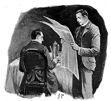 来訪者は、ヨーロッパ一の鋭い推理家、精力的な実行者と聞いていた人物が、気だるげに横たわっているのを見て、意外そうな表情を浮かべた。ホームズはゆっくりと目を開き、いら立たしげに巨大な依頼人を見た。