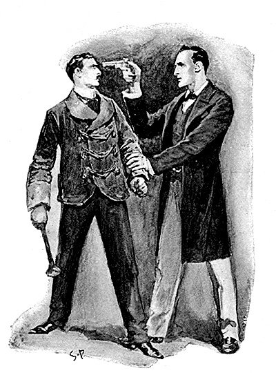 その言葉が終わるか終わらないかのうちに、一人の男が部屋の戸口に姿を現した。ひどく太ってたくましい体格で、手には重そうな棍棒を握っている。ハンター嬢は彼を見て悲鳴を上げ、壁際に身をすくめたが、ホームズは素早く前に進み出て、男と対峙した。