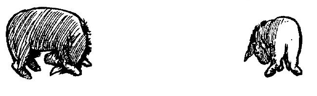 「やっぱりそうか」とイーヨー。「まあ、文句を言うこともできないさ。ぼくには友だちがいるし。つい昨日だって誰かぼくに話しかけてくれた。そして、ラビットがぶつかって『ちぇっ』と言ったのは先週だったか、その前だったか。社交の輪、だね。いつも何かしらあるもんさ。」